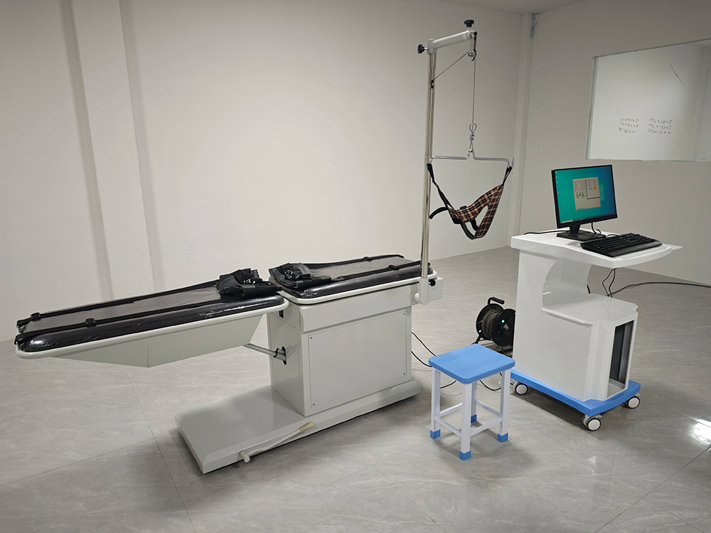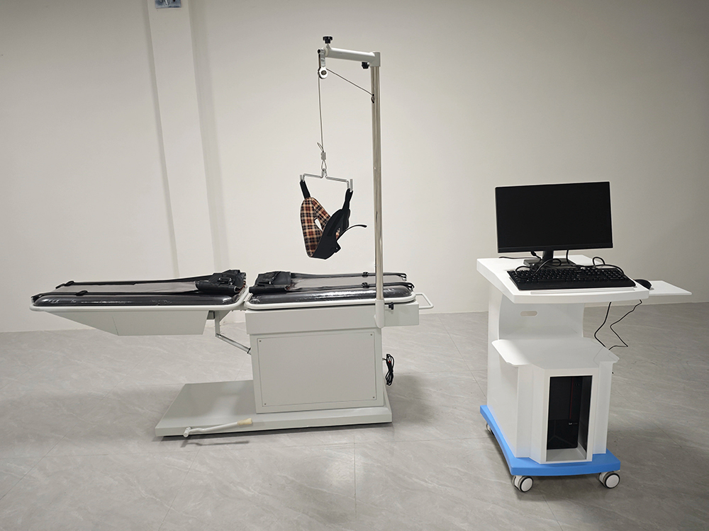 Dette produktet er en tredimensjonal behandlingsseng for livmorhals- og korsryggen, med alle data kontrollert av en mikrokontroller, LCD-skjerm og lineær motor som drivkraften, som fullt ut realiserer intelligent behandling. Rotasjon og vinkelvinkler måles ved hjelp av rotasjonskodingsteknologi, noe som gjør vinkelmåling mer nøyaktig. Korreksjonsbehandlingseffekten er spesielt signifikant for korsryggens bakre ledd. I klinisk praksis kan horisontal trekkraft, vinkeltrekk og rotasjonstrekk utføres separat eller i kombinasjon for å overvinne utilstrekkeligheten til en enkelt handling og oppnå tredimensjonal trekkraft. Lumbal traction og cervical traction kan utføres samtidig. For å sikre pasientsikkerheten, når nakkespenningen er større enn 200N, må bekreftelsesknappen trykkes inn før nakkespenningen økes. Når pasienten føler seg uvel, kan de trykke på nødretrett-knappen og trekkmekanismen vil umiddelbart trekke seg tilbake.