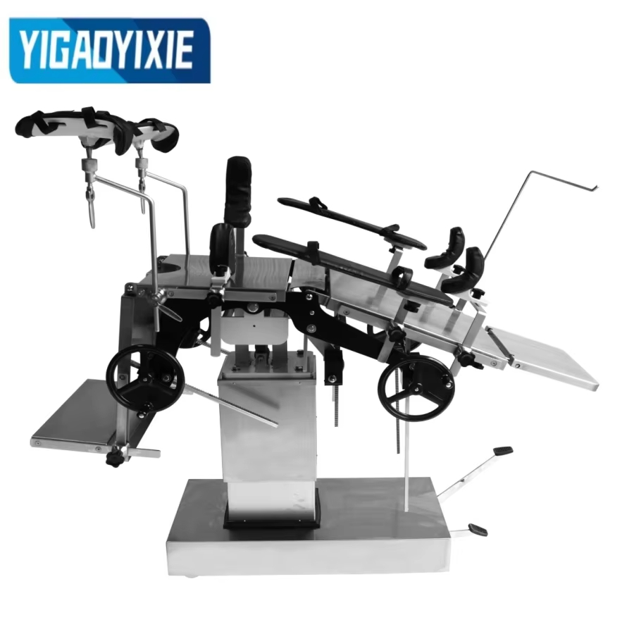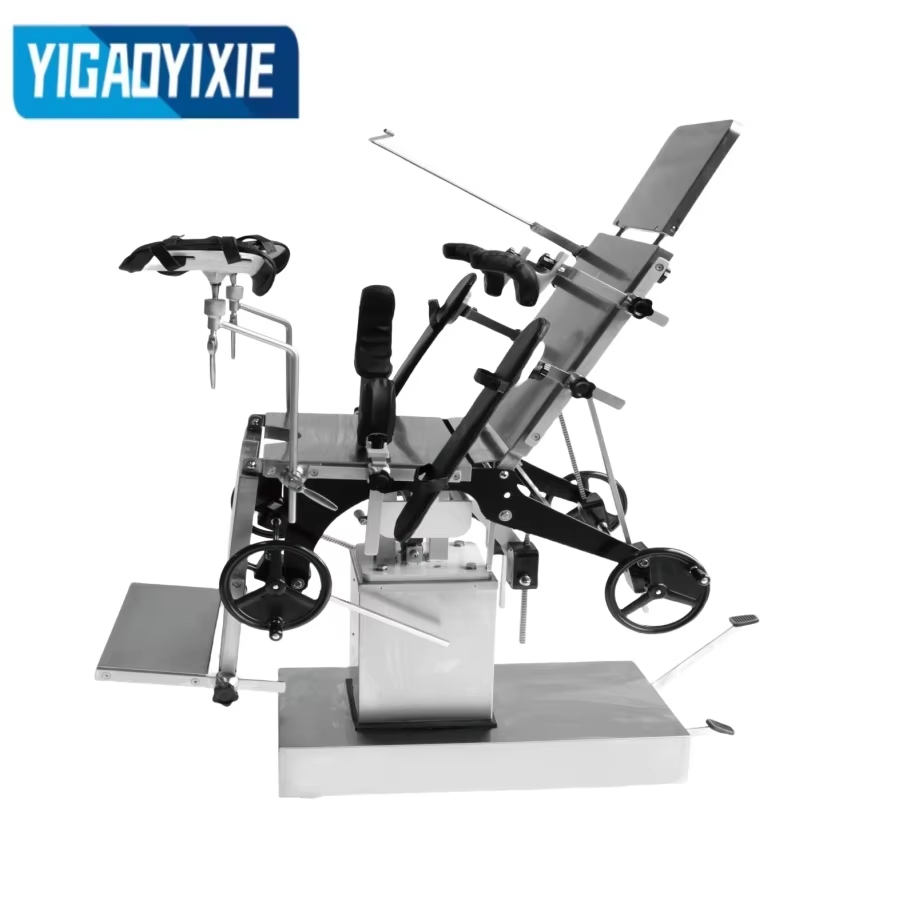 YGS3001 Hydraulisk operasjonsbord i rustfritt stål er en høyytelses medisinsk enhet designet for å støtte pasienter under kirurgi og er mye brukt i ulike kirurgiske operasjoner. Operasjonsbordet består av sengegavl, ryggbrett, korsrygg, hoftebrett og integrert benbrett, som fleksibelt kan justeres for å møte behovene til ulike operasjonsstillinger. Dets hydrauliske løftesystem driver den hydrauliske oljepumpen gjennom en fotpedal, som er enkel å betjene, stabil og støyfri, og egnet for operasjoner som krever hyppig justering av sengehøyden. Opp- og nedfolding, vipping foran og bak, venstre og høyre vipping av ryggplaten og benplaten kan kontrolleres nøyaktig av håndsveivde gir, snekkegir og stativsystemer. Sengegavlen er utformet med spirallås, og korsryggen justeres med en håndsveiv for å sikre stabilitet og sikkerhet. Operasjonsbordplaten er laget av spraybelagt karbonstål, som er slitesterkt og lett å rengjøre. Basen og søyleskallet er laget av rustfritt stål, som er korrosjonsbestandig og antioksiderende, noe som sikrer stabiliteten og utseendet til utstyret for langtidsbruk.